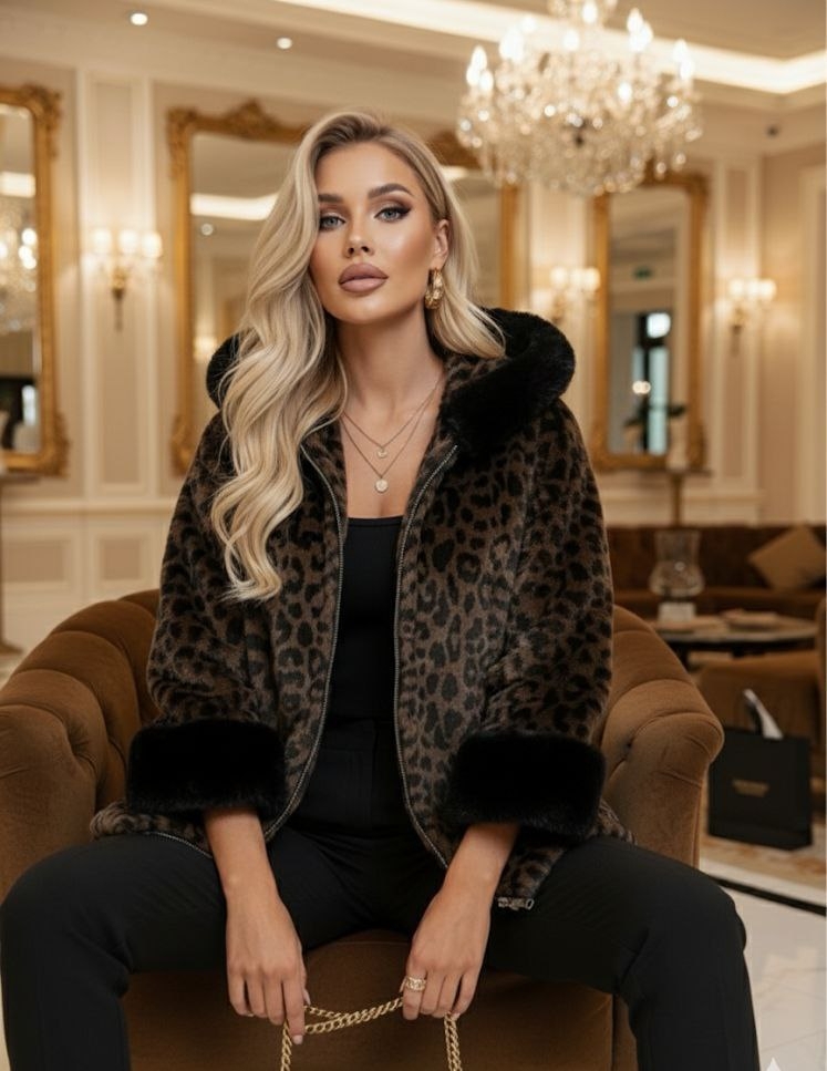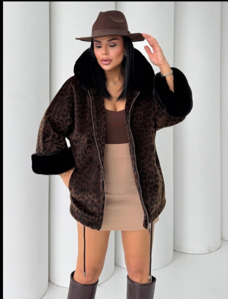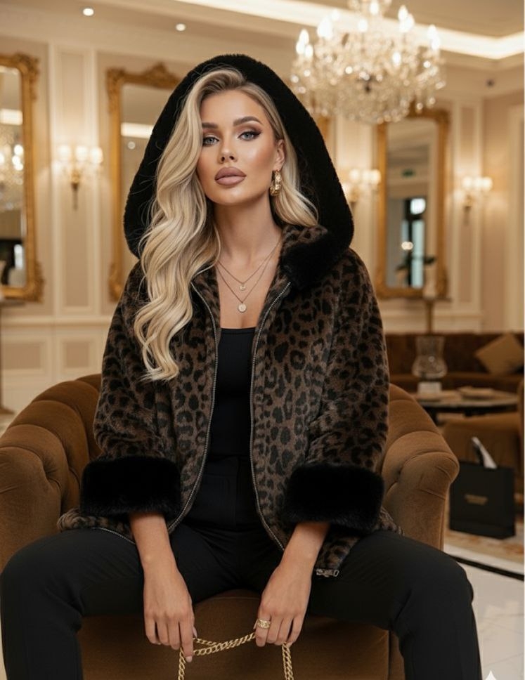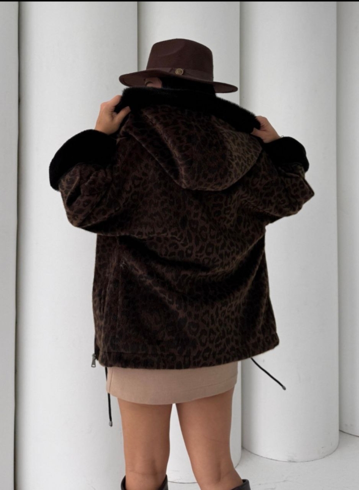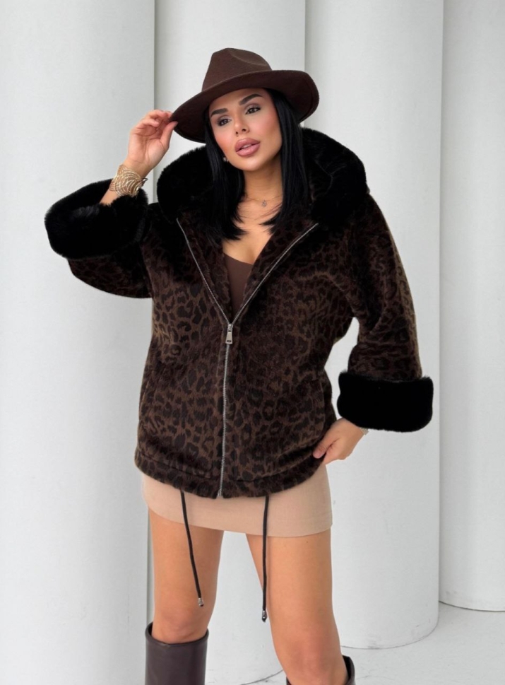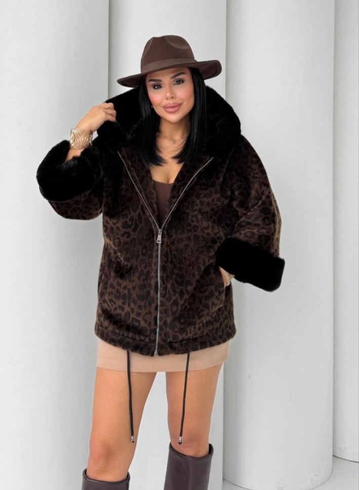 дамско кожено палто с качулка и леопардов принт A7731 кафяв
