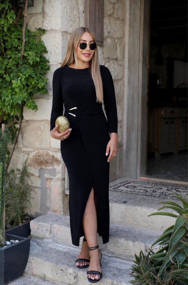 дамска рокля с кръстосано закопчаване и катарама J72346 черен
