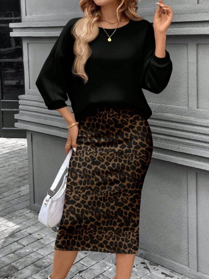 дамски компект две части пола леопардов принт и блуза черна J61994