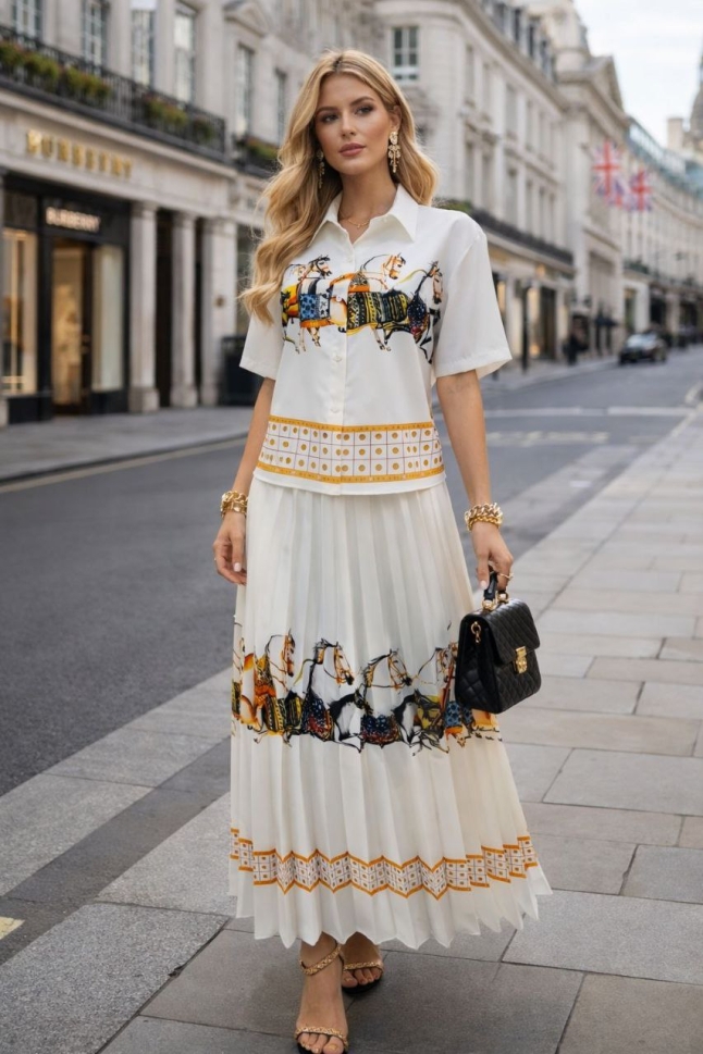 дамски компект плисирана пола и сако с шарки AS7909 бял