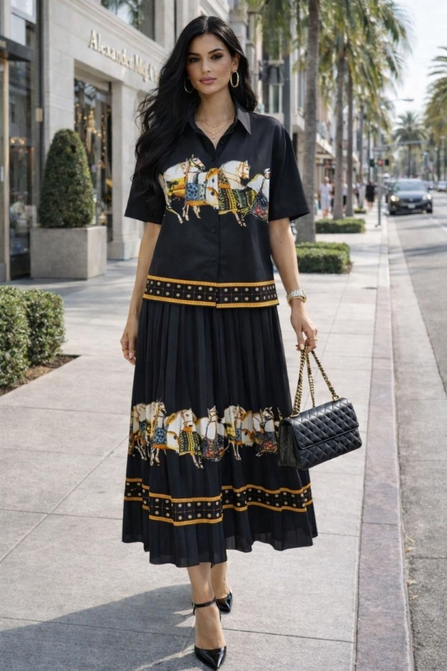 дамски компект плисирана пола и сако с шарки AS7909 черен