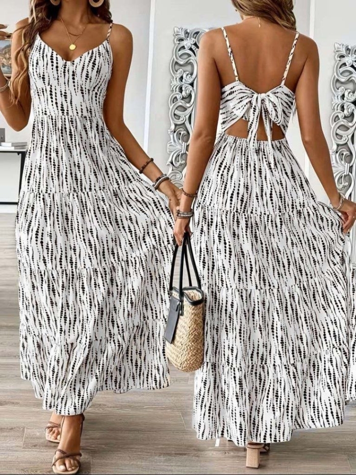 дамска рокля с V деклоте щампа и връзки отзад J76241