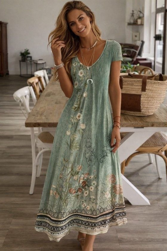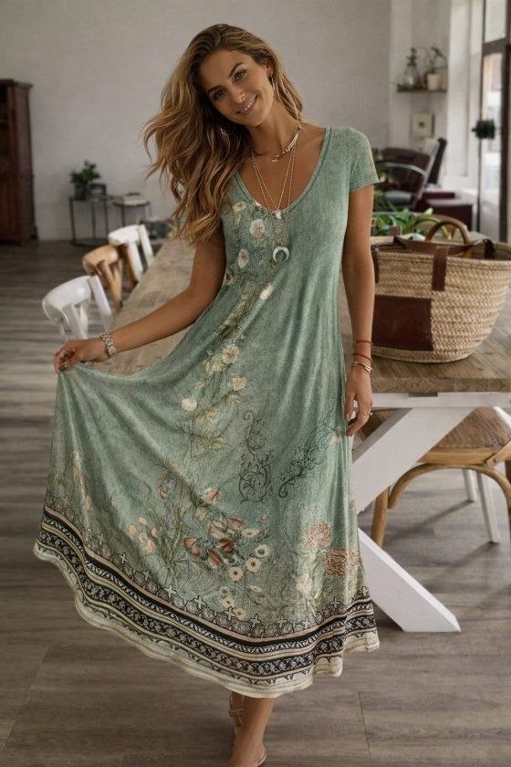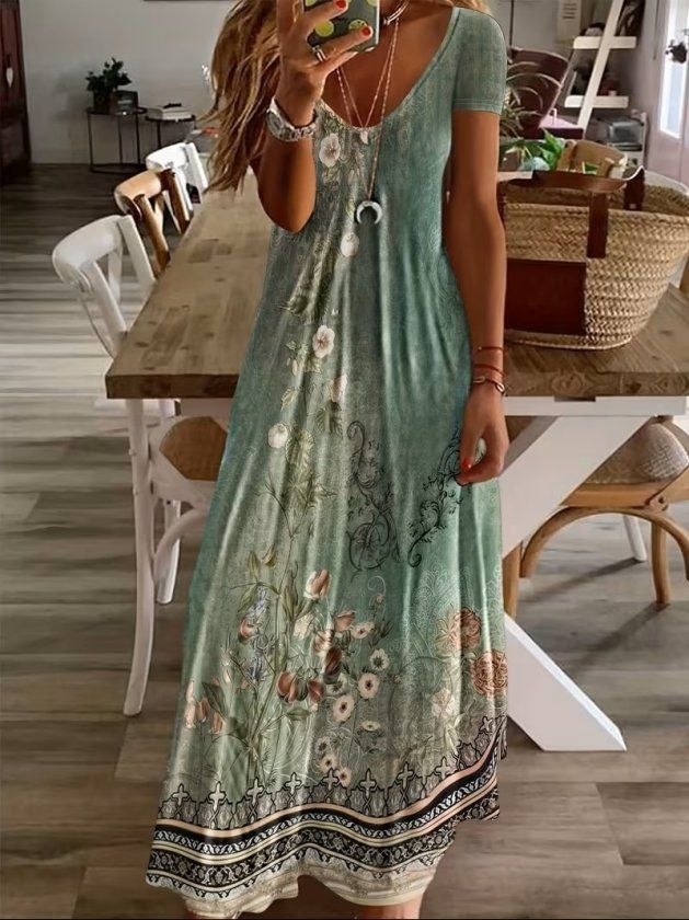 дамска рокля с V деклоте с шарки дълга J76274
