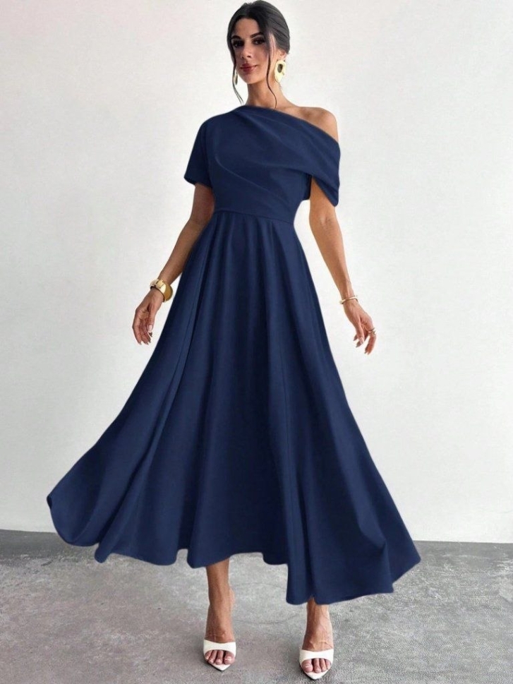 Дамска дълга плисирана рокля от креп с оголени рамене и къс ръкав J62224 син