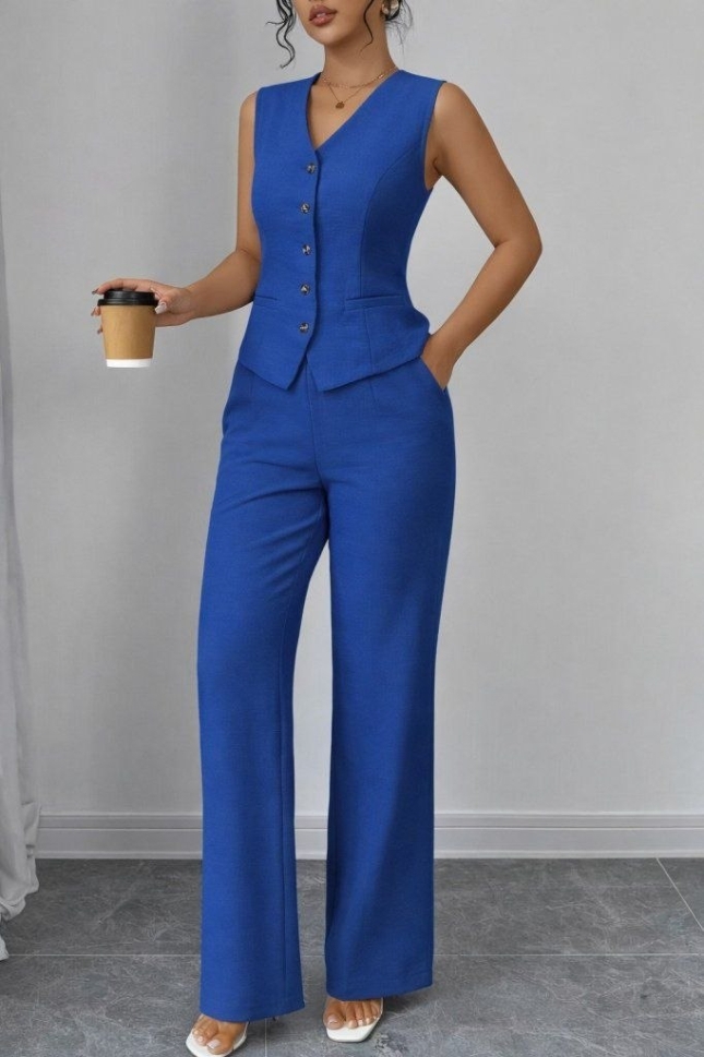 Дамски комплект от две части - блуза и панталон без ръкави с копчета отпред лен J46170 син